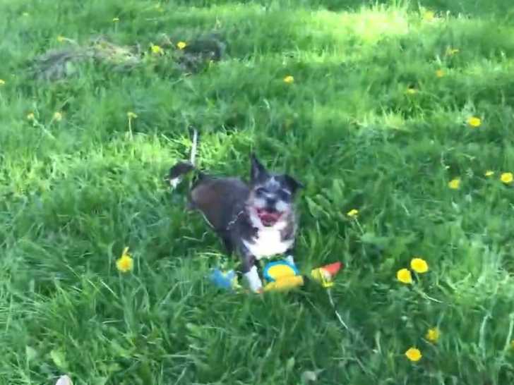 Un Boshih, une race hybride issue du croisement entre le Boston Terrier et le Shih Tzu, s'amuse dans un parc. Il joue avec sa maîtresse qui lui lance son jouet, et il s'occupe de le ramener en courant à toute vitesse et avec une énergie débordante. Il recommence ce jeu plusieurs fois, jusqu'à ce qu'il soit à court d'énergie.
