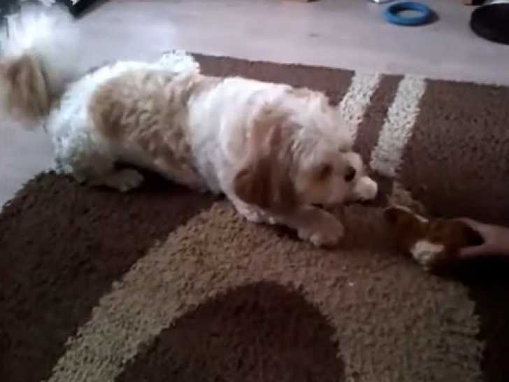 Ce Cava Tzu est amusant. Ses maîtres lui ont apporté un nouveau jouet : une peluche ressemblant à un cochon d'Inde. Le compagnon à quatre pattes est surpris et intrigué. Il s'allonge près de la peluche et se met à aboyer. Le Cava Tzu est le fruit du croisement entre le Cavalier King Charles Spaniel et le Shih Tzu.