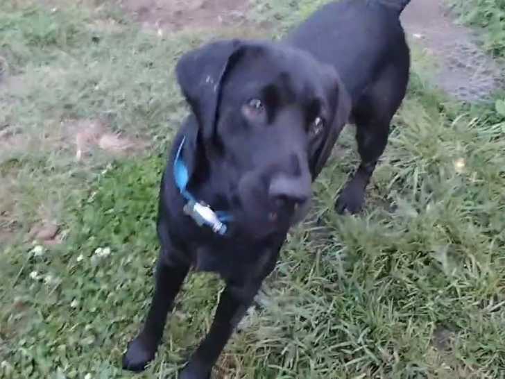 Ce magnifique Goldador au pelage noir tient dans sa gueule un frisbee qu'il donne à son maître. Ce dernier le prend et le jette à l'autre bout du jardin pour que son chien lui ramène. Tout content, ce dernier part en courant pour essayer de l'attraper en plein vol. Issu du croisement entre le Golden Retriever et le Labrador Retriever, le Goldador est un chien énergique, sensible et tolérant.