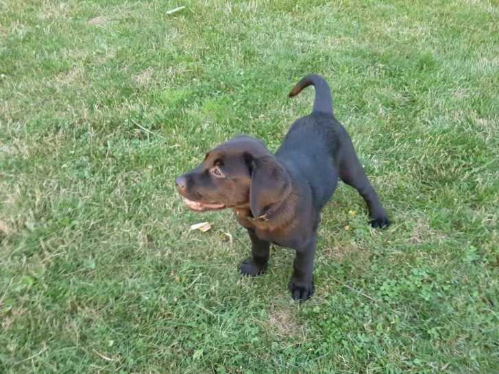 Ce petit chiot Goldador au pelage noir se dégourdit les pattes dans le jardin. Il regarde sa maîtresse en tirant la langue, car il vient de courir à toute vitesse à travers cet immense jardin. Enfin, il aboie doucement pour que sa maîtresse vienne jouer avec lui. Résultat du croisement entre le Golden Retriever et le Labrador Retriever, le Goldador est un chien énergique et doux.