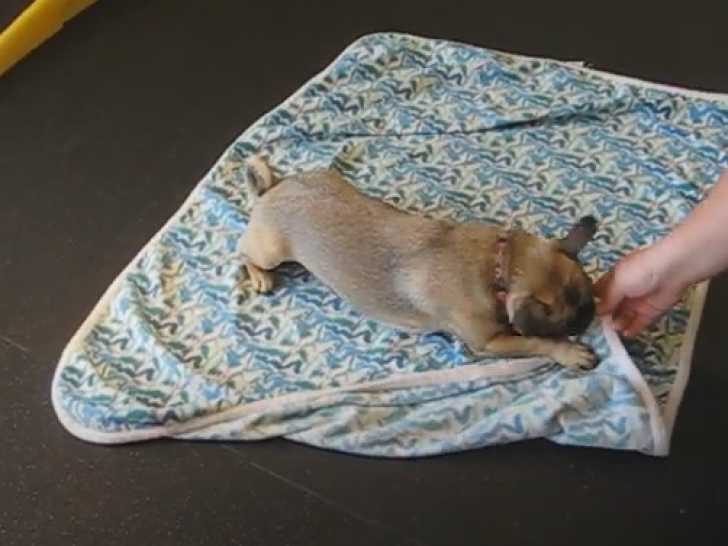 Ce Chug, issu du croisement entre un Carlin et un Chihuahua, partage un moment complice avec sa propriétaire. Confortablement installé sur une couverture, il joue avec sa maîtresse, et elle s'amuse à l'enrouler sous une couette. Ce petit jeu divertit beaucoup le Chug, et pour le récompenser, elle lui donne une friandise.