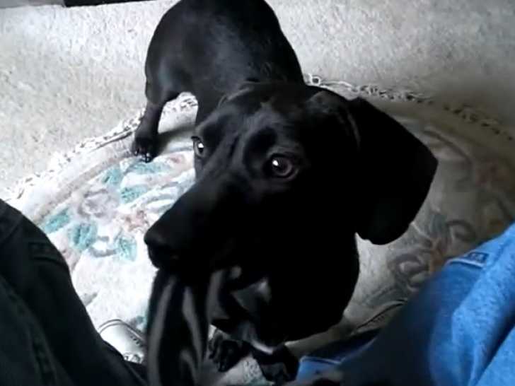 Duke, un Dachsador au pelage noir, s'amuse avec son maître dans le salon. Il a attrapé un morceau de tissu entre ses dents et tire de toutes ses forces pour le récupérer, tandis que son propriétaire le tient fermement entre ses mains. Le Dachsador est issu du croisement entre le Labrador Retriever et le Teckel.