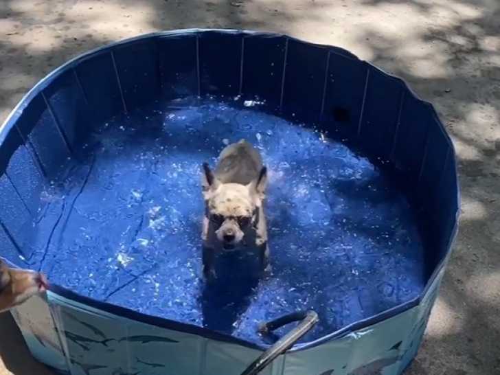 Ce French Bullhuahua a été recueilli par un refuge et s'entend bien avec les autres chiens. Ses propriétaires ont installé une petite piscine dans la cour, et il adore y aller pour se baigner. Il s'amuse à sauter dans l'eau, éclaboussant tout le monde autour de lui. Le French Bullhuahua est le fruit du croisement entre le Bouledogue Français et le Chihuahua.