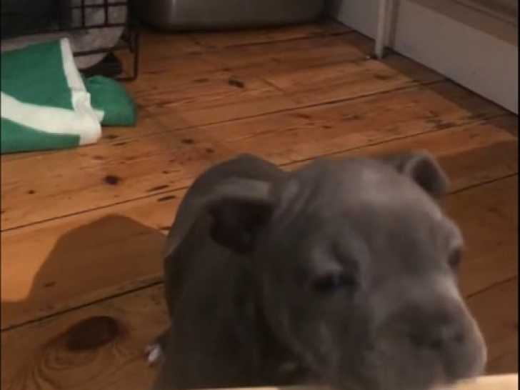 Ernie est un petit Frenchie Staff. Il est installé dans son salon, près de son maître, et s'amuse avec l'un de ses jouets. Il pousse une balle de tennis du bout de ses pattes, puis tente de l'attraper. Une fois fatigué de jouer, il se tourne vers son maître, réclamant des câlins avec un regard attendrissant. Ernie est issu du croisement entre un Bouledogue Français et un Staffordshire Bull Terrier.