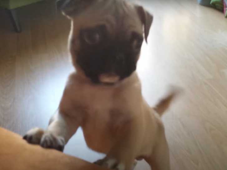 Crixus, un chiot Frug aux courtes pattes, tente à plusieurs reprises de monter sur le canapé de sa maîtresse. Ce n'est qu'après plusieurs échecs que Crixus arrive enfin à grimper, avec l'aide de sa maîtresse, sur ce redoutable meuble.