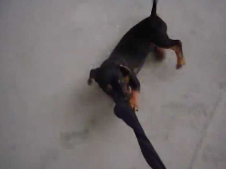 Ce petit Jackshund répondant au nom de Biscuit joue avec un bout de tissu. Il le tient fermement entre ses dents et ne veut pas le lâcher, tandis que son maître tire de l'autre côté pour le récupérer. Le Jackshund est issu du fruit du croisement entre le Jack Russell et le Teckel.