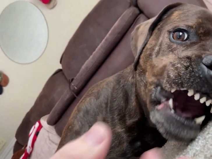 Ce Rotticorse passe un moment paisible aux côtés de son maître, allongés tous les deux sur le sol. Cherchant à jouer, son propriétaire agite doucement sa main devant le visage de son chien. Ce dernier réagit avec amusement, en mordillant légèrement la main sans jamais lui faire mal. Le Rotticorso est issu du croisement entre le Rottweiler et le Cane Corso.
