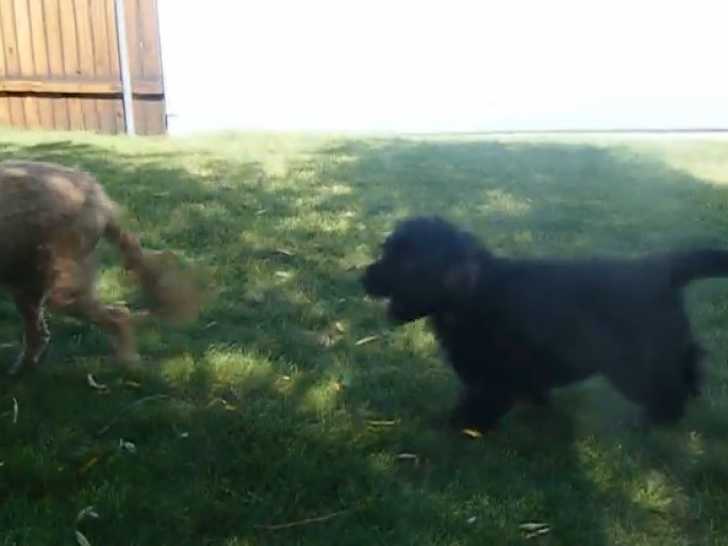 Porter, un Rottle, est sorti jouer à l'extérieur. Il s'amuse à faire semblant de se battre avec d'autres chiens. Ils échangent de légers coups de patte et grognent en se sautant dessus, mais leur maître veille à ce que cela reste un jeu. Le Rottle est issu du croisement entre un Caniche et un Rottweiler.