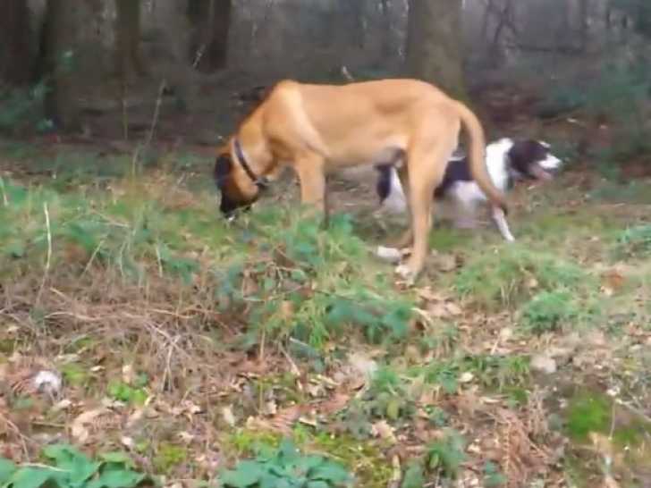 Ce Saint Bermastiff, âgé de quelques mois, profite d’une agréable promenade en compagnie de sa maîtresse. Il marche sans laisse aux côtés d’un Springer Spaniel, et tous deux suivent tranquillement un sentier sinueux à travers les bois. Sage et bien éduqué, le jeune Saint Bermastiff ne s'éloigne jamais trop loin, restant toujours à proximité de sa maîtresse. Ce Saint Bermastiff, issu du croisement entre un Saint-Bernard et un Bullmastiff, est sage et ne s'éloigne jamais trop loin.