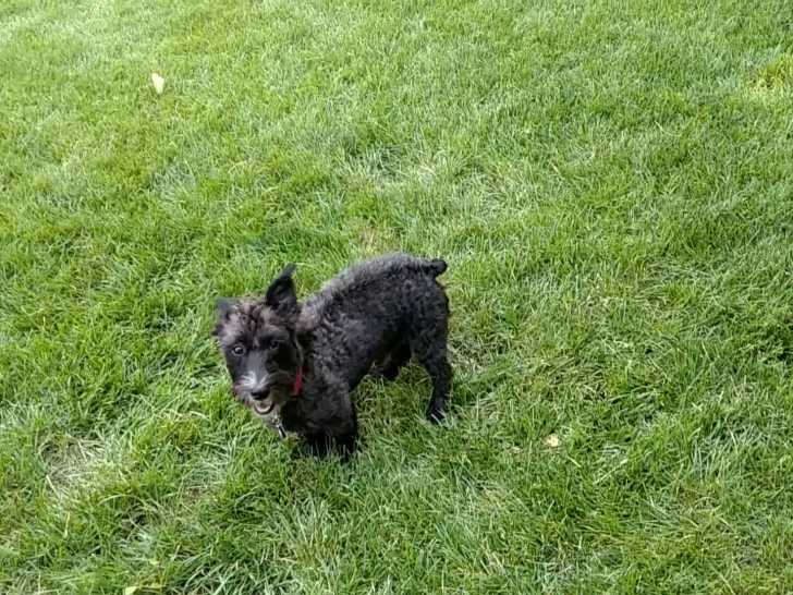 Ce jeune Scoodle nommé Rufus s’amuse à jouer à la balle avec son maître dans le jardin. Issu du croisement entre le Caniche et le Scottish Terrier, le Scoodle est une race connue pour son énergie et son caractère joueur. Chaque fois que son maître lui lance la balle, Rufus s’élance avec enthousiasme avant de la ramener pour qu’il puisse recommencer.