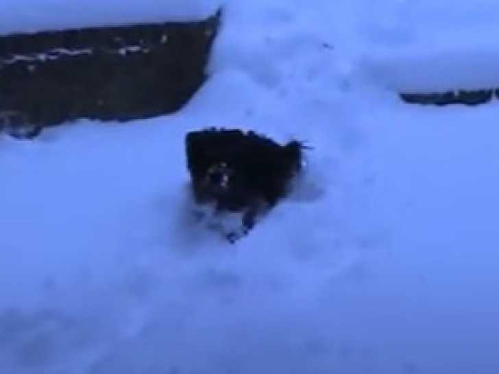 Ce Scoodle au pelage noir nommé Austin est absolument adorable. Il découvre la neige et s'amuse à sauter dedans. Sa fourrure est parsemée de flocons, et son visage en est recouvert, ce qui amène ses maîtres à éclater de rire. Le Scoodle est le résultat d'un croisement entre le Caniche et le Scottish Terrier.