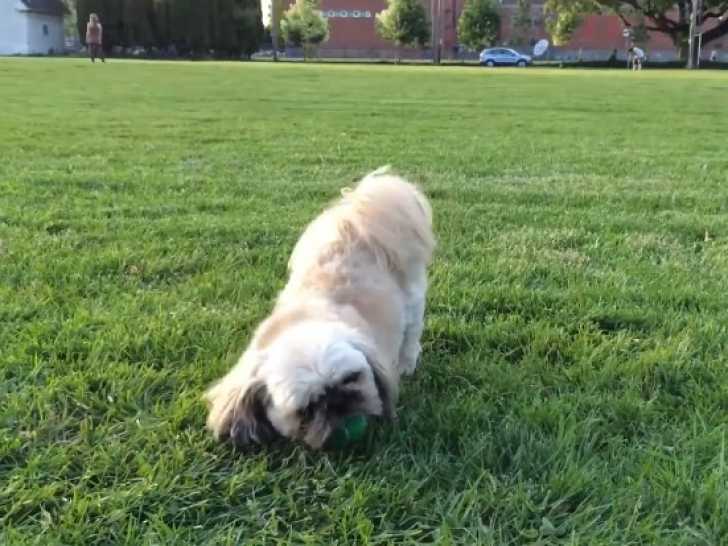 Ce Shinese est un grand joueur. Son maître l'a emmené se balader dans un parc et a apporté un jouet. Ils disposent d'un grand espace, où son maître lance une balle au loin. Le chien court à toute vitesse pour la récupérer et la lui ramener, s'amusant à chaque aller-retour. Le Shinese est issu du croisement entre le Shih Tzu et le Pékinois.