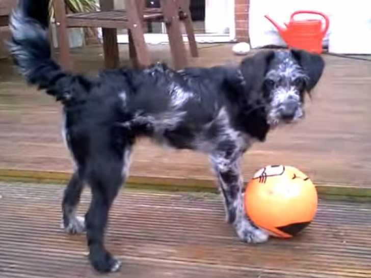 Lola, une adorable jeune chienne Bordoodle au pelage gris et noir, a une affection particulière pour son jouet en forme de ballon qu'elle transporte partout avec elle. La personnalité de ce Bordoodle, issu du mélange entre un Caniche et un Border Collie, se caractérise par sa nature affectueuse, fidèle et joueuse.