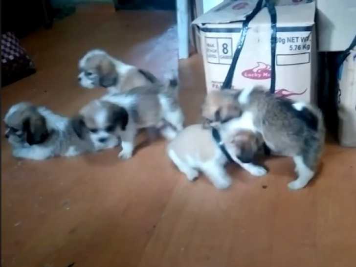 Cette portée de Bea-Tzu joue joyeusement dans le salon, débordante d'énergie et montrant une grande sociabilité entre eux. Issu du croisement entre le Beagle et le Shih Tzu, le Bea-Tzu est un chien amical envers les humains et les enfants. Il a besoin et de courir et de jouer quotidiennement pour s'épanouir.