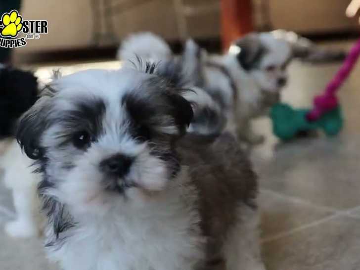 Cette portée de petits Mal-Shi joue joyeusement dans le salon. Ils poursuivent avec enthousiasme et tentent d'attraper un jouet que leur propriétaire tient dans sa main. Ce moment ludique avec la fratrie met en lumière la sociabilité caractéristique de la race.
