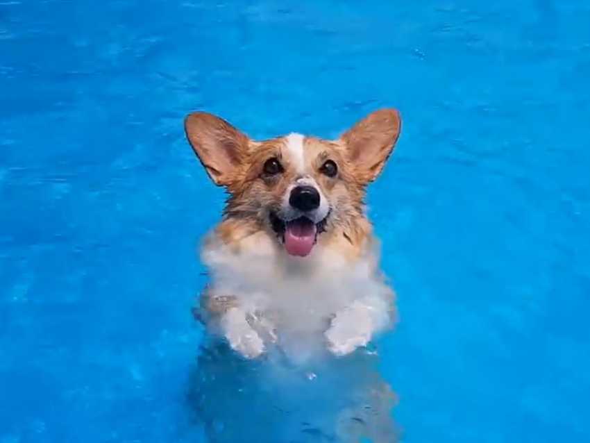 Quatre Welsh Corgi se rafraichissent dans la piscine. Ils nagent et jouent ensemble. Ils s'amusent à monter sur le matelas gonflable et profitent d'un bain de soleil! Ils sortent de l'eau à l'aide d'un plan incliné en bois installé au rebord de la piscine. Ces chiens sont de bons nageurs et aiment se dépenser!