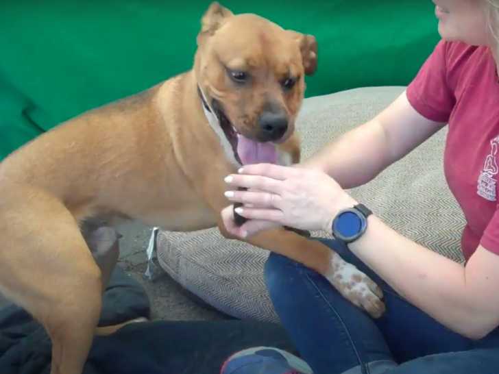 Rocko est un chien issu du croisement entre le Boxer et le Berger Allemand, ce qui fait de lui un Boxer Shepherd. Il recherche un nouveau foyer pour l'accueillir. En attendant, il fait beaucoup de câlins à sa soigneuse qui s'occupe de lui en le nourrissant et en jouant avec lui.