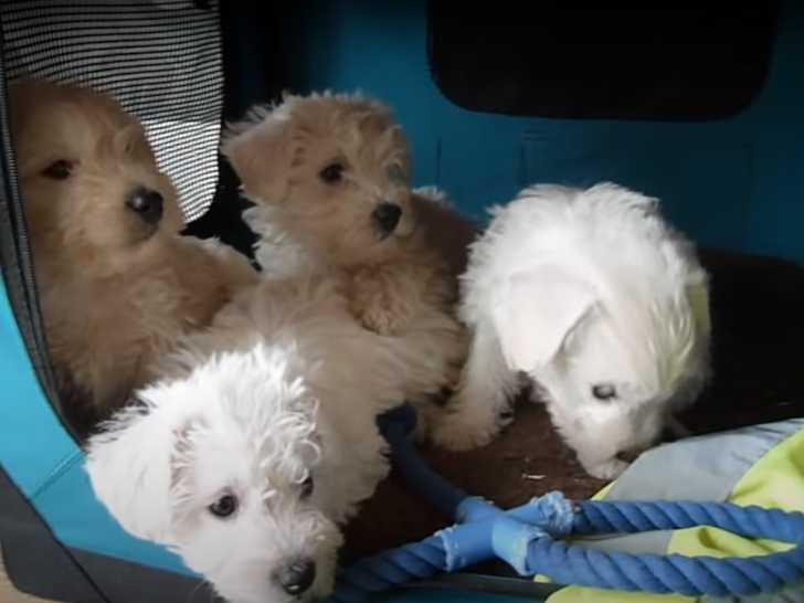 Ces adorables petits Westiepoo semblent tout excités de voir leurs nouveaux maîtres arriver. Nés d'un père Caniche Nain et d’une mère West Highland White Terrier, ces petits chiots joueurs viennent chercher des caresses. Ils en reçoivent sans difficulté, tant leur pelage doux et leurs yeux brillants ont de quoi faire fondre n’importe qui. En tout cas, ils sont pleins d'énergie et prêts à explorer le monde avec leur nouvelle famille.