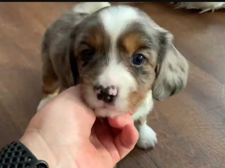 Ces petits chiots Aussaliers passent un moment avec leur nouvelle famille. Ils ont des jouets, des croquettes et reçoivent beaucoup de caresses de la part de leurs maîtres. Ils se montrent adorables et curieux en découvrant leur environnement. L'Aussalier est le fruit du croisement entre le Cavalier King Charles Spaniel et le Berger Australien.