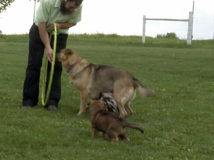 Dans un parc, ces adorables chiots German Australian Shepherd s'amusent avec leur mère et leur propriétaire. Ils la suivant partout et lui courent après. Pendant ce temps, la mère est en train d'apprendre à sauter à travers un cerceau tenu en hauteur par son maître, démontrant sa vivacité et son intelligence. Ces chiots, nés du croisement entre le Berger Australien et le Berger Allemand, attendent avec impatience de trouver une famille aimante pour les accueillir.