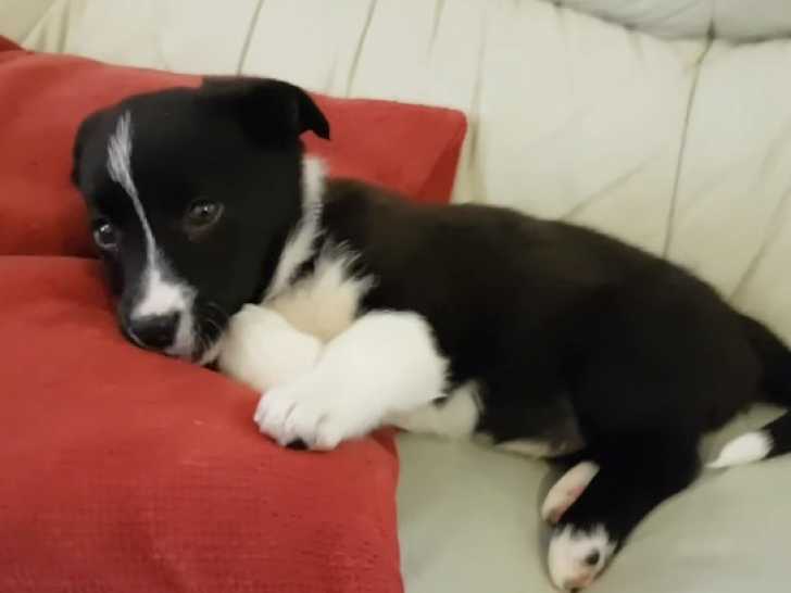 Ce propriétaire vient tout juste d'adopter un adorable petit Borgi au pelage noir et blanc. Il est extrêmement ravi et aime passer du temps en compagnie de son nouveau compagnon à quatre pattes. Il laisse le chiot explorer librement le jardin et la maison, tout en profitant de l'occasion pour lui offrir quelques câlins. Le Borgi est une race hybride très fidèle et obéissante issue du croisement entre le Border Collie et leWelsh Corgi Cardigan.