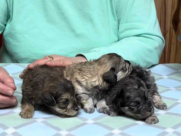 Trois chiots Schnoodles âgés de trois semaines sont présentés individuellement par une spécialiste de la race. Ce croisement entre le Caniche et le Schnauzer Moyen est connu pour sa vivacité et son intelligence. Ces chiots sont disponibles à l’adoption et la spécialiste souligne leur potentiel à devenir des compagnons affectueux et pleins de vie.