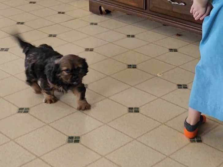 Ce Cava Tzu se promène dans la cuisine, profitant des caresses qu'il peut recevoir de la part de ses propriétaires. Ce compagnon attachant et loyal est à la recherche d'une famille aimante pouvant l'adopter. Le Cava Tzu est le fruit du croisement entre le Cavalier King Charles Spaniel et le Shih Tzu.