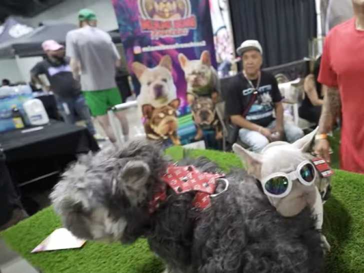 Ce French Boodle, issu du croisement entre un Bouledogue Français et un Caniche, est installé sur une table lors d'un salon dédié aux différentes races de chiens. Il se montre calme et affectueux. Son propriétaire souhaite le vendre et il le présente donc aux visiteurs intéressés, précisant qu'il a vendu le frère de ce chien pour plusieurs milliers d'euros.