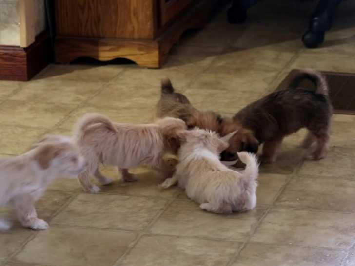 Toute cette portée de chiots Havashire s'amuse pour la dernière fois ensemble avec leurs parents, car après cela, ils partiront chacun dans une nouvelle famille différente. Ainsi, ils courent dans tous les sens et à toute vitesse dans le salon. Issu du croisement entre le Bichon Havanais et le Yorkshire Terrier, le Havashire est un chien curieux, parfois même obstiné.