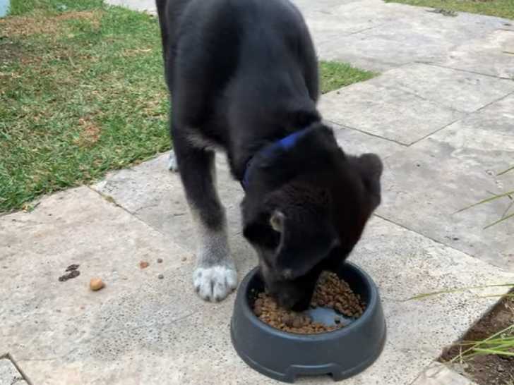 Le repas de ce jeune Labsky est servi. Son maître prend soin d'écraser minutieusement sa pâtée dans sa gamelle, ajoutant même une friandise par-dessus pour lui faire plaisir. Le chien attend patiemment dans le jardin, obéissant à chaque commande pour mériter son dîner. Le Labsky est issu du croisement entre le Labrador Retriever et le Husky Sibérien.