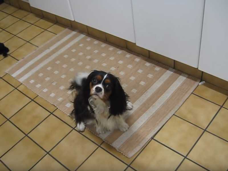 Ce Cavalier King Charles qui vient de manger à pourtant déjà faim. Parviendra-t-il à convaincre à sa maîtresse de lui donner à nouveau à manger ?