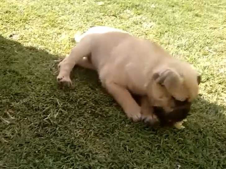 Cet adorable petit Pom-a-Pug découvre un nouvel aliment. Sa maîtresse a décidé de lui faire goûter un fruit, mais il semble qu'il ne l'apprécie pas vraiment. Il le mâche longtemps dans l'herbe, avant de se lever et de s'éloigner, manifestement déçu. Le Pom-a-Pug est le fruit du croisement entre le Carlin et le Loulou de Poméranie.