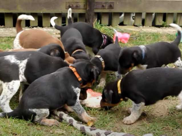 Bien déterminés à ne pas en perdre une miette, une dizaine de chiots Cesky Strakaty Pes se partagent une large pièce de viande.