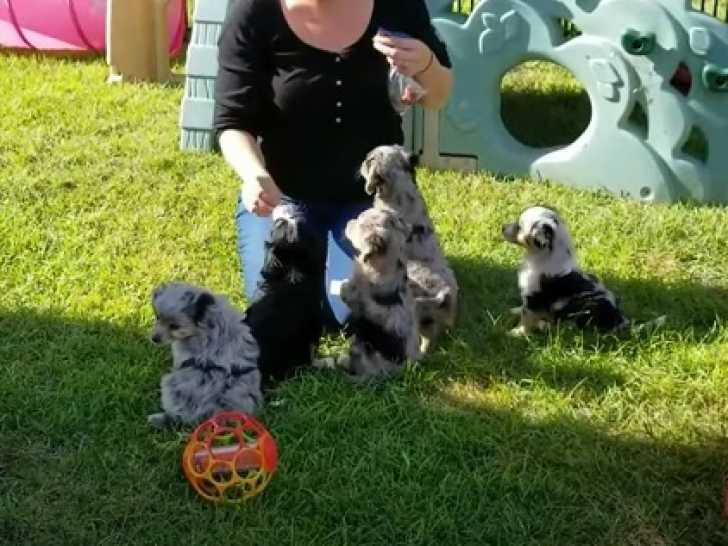 Ces adorables petits Aussaliers sont dans leur jardin au soleil. L'Aussalier est le fruit du croisement entre le Cavalier King Charles Spaniel et le Berger Australien. Ils sont issus de la même portée et attendent tous patiemment, assis dans l'herbe, pour recevoir des friandises. Certains d'entre eux se montrent un peu plus agités et se mettent debout pour atteindre plus facilement leurs récompenses, mais leur maîtresse ne leur donne une friandise que lorsqu'ils sont bien assis.