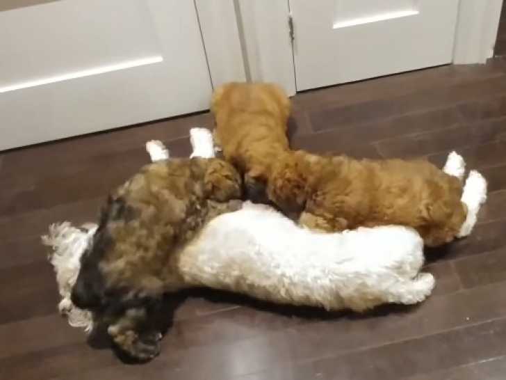 Ces adorables petits Woodle au pelage marron ont seulement six semaines. Leur mère veille sur eux avec tendresse, les allaitant et les nourrissant avec soin. Les chiots, paisiblement allongés autour d'elle, se nourrissent tandis qu'elle s'étend sur le sol, immobile et attentive. Parfois, leur maître les aide à se positionner afin de déranger le moins possible leur mère pendant ce moment précieux.