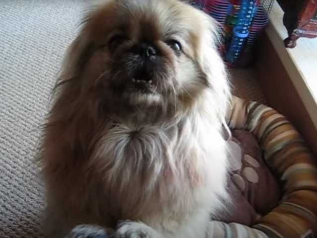 Dans cette vidéo, un Pékinois est fou de pastèque, et le fait bien savoir : le chien mendie à manger à son maître. Il se met sur ses pattes arrières afin de faire le beau et obtenir ainsi l'objet de sa convoitise.