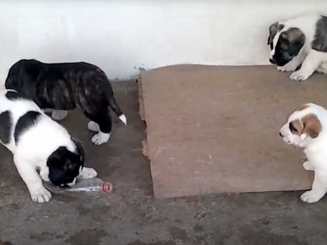 Voici des magnifiques chiots Raferio do Alentejo qui sont à peine âgés de 4 semaines. Comme on peut le voir dans cette vidéo, ils se nourissent déjà de croquettes lorsqu'ils ont un petit creux entre leurs parties de jeu, de telles activités aiguisant leur appétit. D'ailleurs, les jeunes molosses ont bon appétit et les gamelles sont bien remplies.