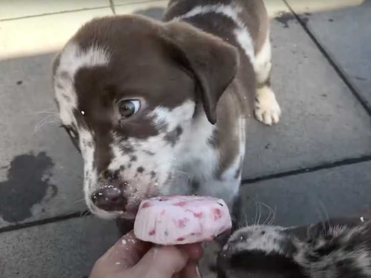 Ce petit Aussiedor mange avec passion une glace pour la première fois avant d'être rejoint par ses frères et sœurs. Ensemble, ils apprécient cette glace qu'ils n'ont pas l'habitude de manger. Ces Aussiedors, issus du croisement entre le Labrador Retriever et le Berger Australien, sont sociables et aiment être en compagnie d'autres chiens.