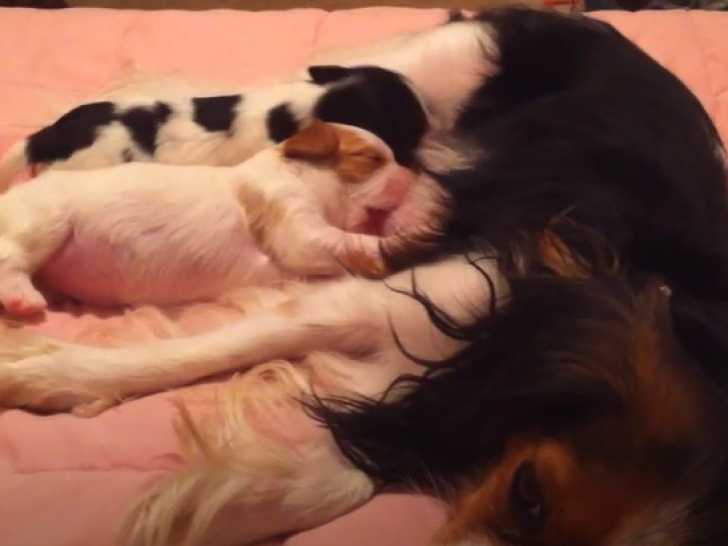 Cette chienne est la mère de deux petits Cavalon. Ils n'ont que deux semaines et ont encore besoin d'être allaités. Elle s'allonge donc calmement sur le côté pour que ses petits puissent venir téter. Le Cavalon est issu du croisement entre l'Épagneul Nain Continental Papillon et le Cavalier King Charles Spaniel.