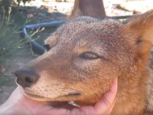 Comme plusieurs autres canidés, les chacals à chabraques peuvent être approchés assez facilement. Il n'est cependant pas précisé si l'animal qu'on voit ici a été apprivoisé étant adulte, ou s'il a vécu au contact des humains dès son jeune âge. En tout cas, il ne semble absolument pas effrayé et paraît même beaucoup apprécier les caresses qu'on lui dispense.
