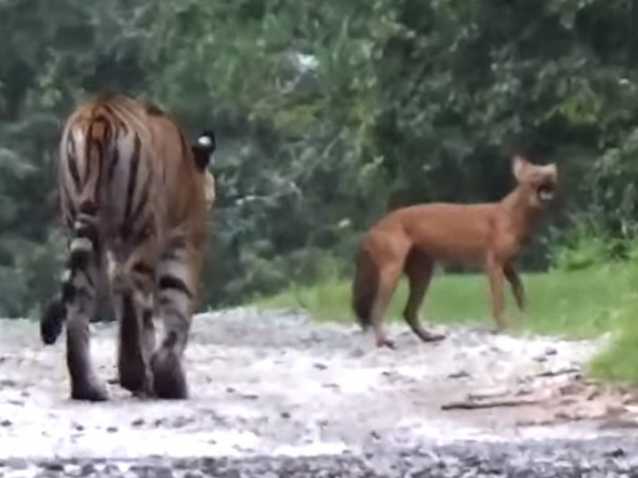 Un dhole isolé bat en retraite devant un tigre du Bengale. Il ne semble pas vraiment apeuré, car sa grande endurance à la course le met à l'abri des crocs du félin qui malgré sa force et son gabarit se fatigue plus vite que lui. Mais le roi de la jungle n'entend pas pour autant le laisser s'en tirer à si bon compte.