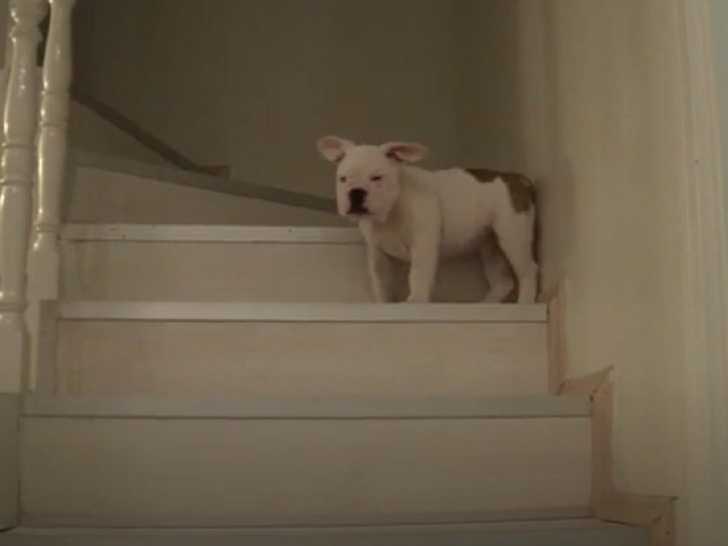 Mario, un adorable Free-Lance Bulldog, se retrouve dans une situation qui l’effraie : il a monté quelques marches d’escalier, mais n’ose plus redescendre. Figé, il fixe son propriétaire avec un regard paniqué, tandis que celui-ci tente de le rassurer. Mario est issu du croisement entre un Bouledogue Français et un Bouledogue Anglais.