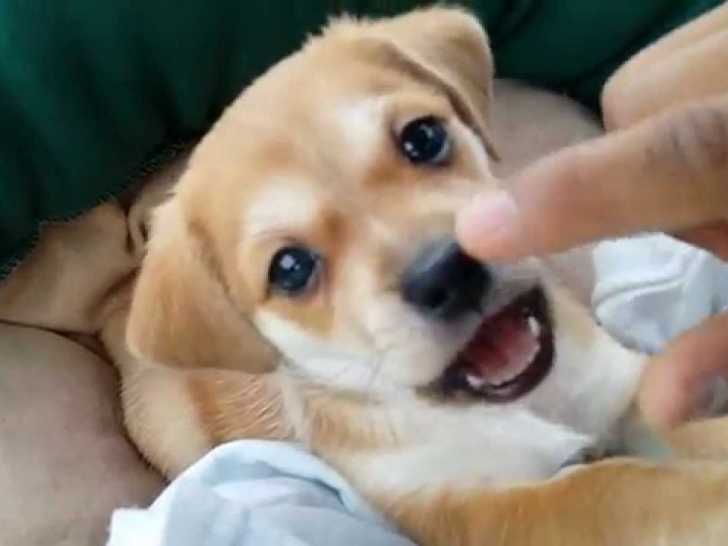 Un petit Jack-Tzu aux yeux pétillants regarde sa maîtresse et se rapproche d'elle pour recevoir des caresses et jouer. Il se met sur le dos et commence à mordiller la main de sa maîtresse avec un regard attendrissant. Issu du croisement entre le Jack Russell et le Shih-Tzu, le Jack-Tzu est, comme le montre cette scène, très affectueux et câlin.