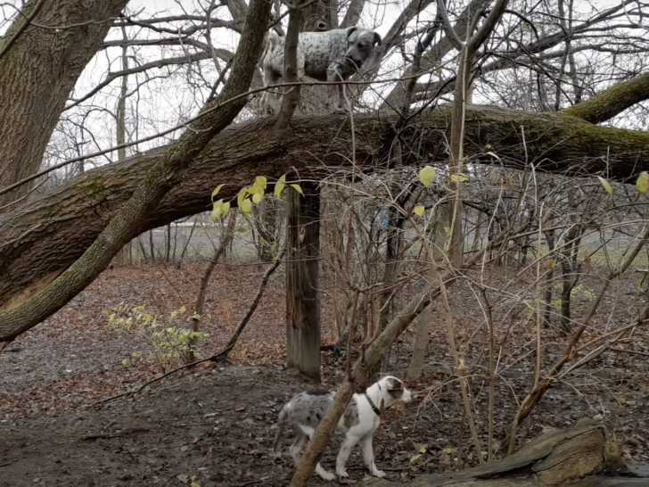 Ces deux Catahoula Heeler sont en balade dans la forêt et ils en profitent pour s'amuser. Résultat du croisement entre le Chien Léopard Catahoula et le Bouvier Australien (Heeler), le Catahoula Heeler est un chien énergique. C'est notamment pour cela que l'on peut voir ces deux chiens monter sur les troncs d'arbres tels des acrobates.