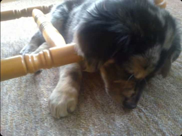 Domino, un Australian Retriever, s'assoupit en s'appuyant contre une chaise en bois. Ses doux ronflements résonnent discrètement, laissant présager que le réveil s'annonce difficile pour ce chiot de seulement 10 semaines. L'Australian Retriever obtenu par le croisement entre le Berger Australien et le Golden Retriever, peut hériter de diverses qualités telles que la sociabilité et l'intelligence, faisant de lui un compagnon idéal pour les familles.