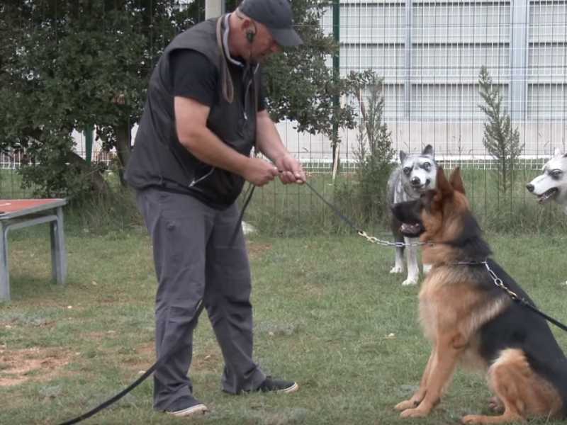 Dans les stages canins, il y a bien évidemment des ateliers pour apprendre à gérer et à calmer l'agressivité de son chien. Dans cette vidéo, c'est sur un Berger Allemand que l'instructeur canin explique et montre aux propriétaires de chiens de compagnie comment faire.