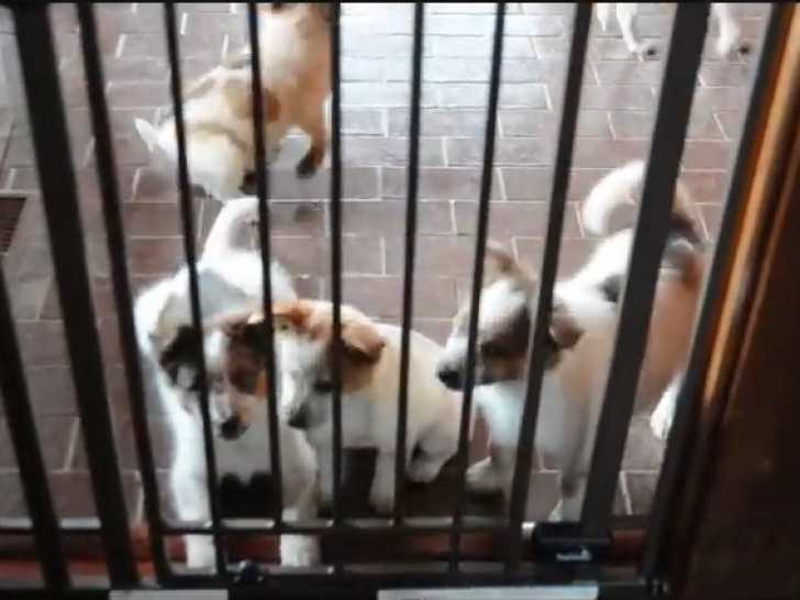 Les propriétaires de ces Australian Eskimos ont installé une barrière pour séparer les différentes pièces de leur maison. Ainsi, leurs chiens doivent patienter jusqu’à ce que quelqu'un vienne leur ouvrir pour accéder au reste de la maison. L'Australian Eskimo est issu du croisement entre un Esquimau Américain et un Berger Australien.
