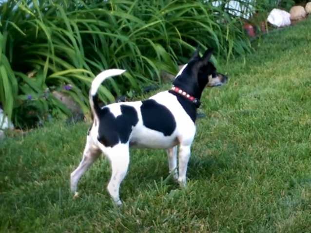 Voici un Rat Terrier qui semble avoir vu quelque chose au fond du grand jardin familial. Tous les sens en éveil, il surveille son territoire à tel point qu’il aboie longuement.