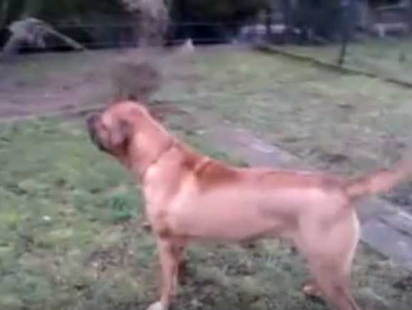 Cette vidéo montre un Tosa Inu remplissant à merveille son rôle de chien de garde, en étant visiblement prêt à en découvre avec un individu ou un autre chien s'approchant un peu trop près de son territoire. Son maître est dans les parages et ne manque pas de calmer le chien, qui se montre plutôt obéissant.