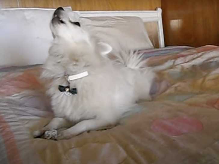 Sparky, un petit Australian Eskimo blanc, "chante" lorsqu'il entend son maître jouer de la musique. Allongé sur le lit, il aboie sur le rythme de la musique avec un air mélancolique. Issu du croisement entre le Berger Australien et l'Esquimau Américain, l'Australian Eskimo est un parfait compagnon, affectueux et très gentil.